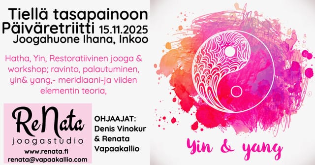 Kaipaatko vinkkejä, kuinka huolehtia omasta jaksamisesta ja tasapainoisesta elämästä? Kuinka ennaltaehkäistä uupumista ja stressiä. Päiväretriitissä ohjelma koostuu kolmesta joogaharjoituksesta, (hatha, yin ja restoratiivinen), joista ammentaa helppoja ja toimivia harjoituksia omalle kotimatolle, sekä Kiinalaisen lääketieteen asiantuntijan, Denis Vinokurin ”workshop”, jossa aiheina mm. palautuminen ja ravinto. Kiinalaisen lääketieteen avulla voimme lisätä ymmärrystämme kehon ja mielen välisestä vuorovaikutuksesta, ja kuinka stressi vaikuttaa eri tavoin eri ihmisiin. Workshopissa käydään läpi Meridiaani, – sekä Viiden elementin teoria, joita opit soveltamaan oman hyvinvoinnin tueksi, ja saat vinkkejä millainen ruokavalio tukee elementtityyppiäsi.